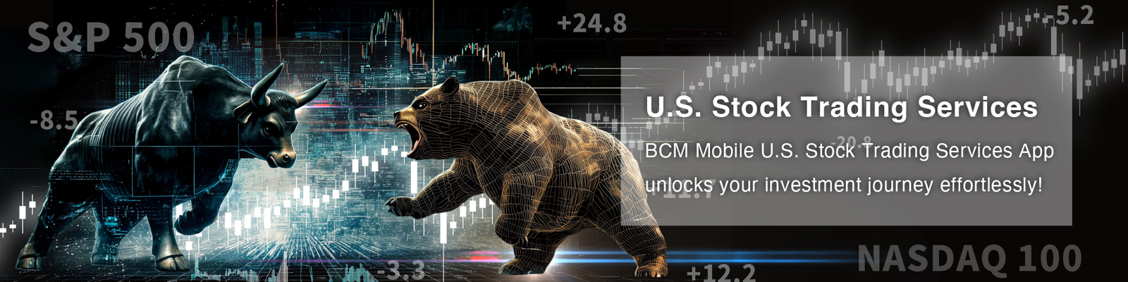 ![]() ![]() BCM Mobile US Stock Trading ServiceInvest in U.S. Markets, Opportunities at Your CallProduct Features Service Features Comprehensive Service FAQBCM (“the Bank”) provides customers with a convenient and professional US stock trading platform. Through the “BCM Mobile US Stock Trading Service“ application, you can make a US stock trading order anytime and anywhere, keep abreast of the latest information of the US stock market, and make US stock investments at your call. Flexible Trading Channels - BCM US Mobile Securities Trading Service The platform runs in a native app, customers simply need to download and install the “BCM US Mobile Securities Trading Service” app by IOS or Android devices. They can enjoy a fast, simple, secure and reliable mobile securities trading services anytime, anywhere. Also, they can easily access US stock market information and complete the US stock order in an instant. Real-Time Information of US Stock Market After log-in, to obtain the latest US stock quotes and market information. Simple Operation with One-click Trading The interface is easy to use, helping you place orders quickly and trade US stocks at ease. Fund Transfer in a Flexible Way By using the “Transfer” function in the app, customers can directly perform FX transaction between your HKD and USD bank accounts, allowing you to allocate funds flexibly. Types of Buy/Sell Orders and Optional Good Till Periods The Bank provides US stock trading orders such as limit orders and stop - limit orders, and sets valid periods, including valid for the day/week/month, or within the specified dates. Set up Watch List and Price Alert as Needed Customers can add/delete stocks from the watch list as needed, closely tracking the trends of their favorite stocks. In addition, price alerts can be set to seize every investment opportunity. A Favorable Commissions of US Stock Trading Order Deals Merging on Same Trading Day Timely And Consolidated Account Information A Secure and Reliable Mobile Securities Trading Experience Convenient Login Method