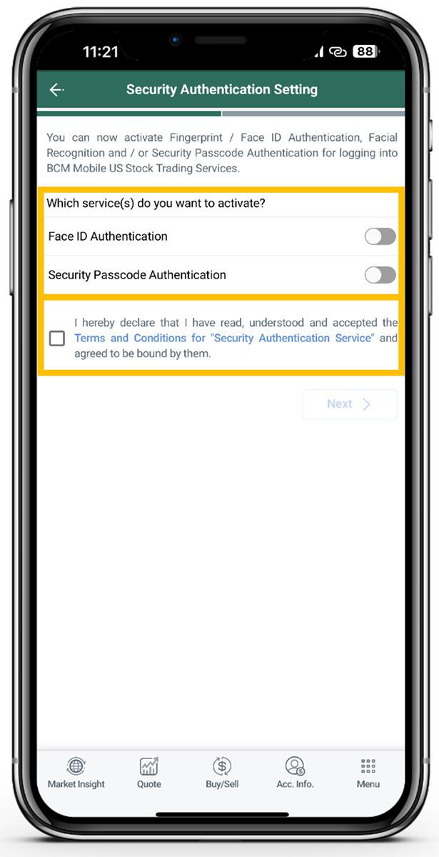 Before clicking to “Next” button, please read through and accept the “Terms & Conditions” for Security Authentication Service.