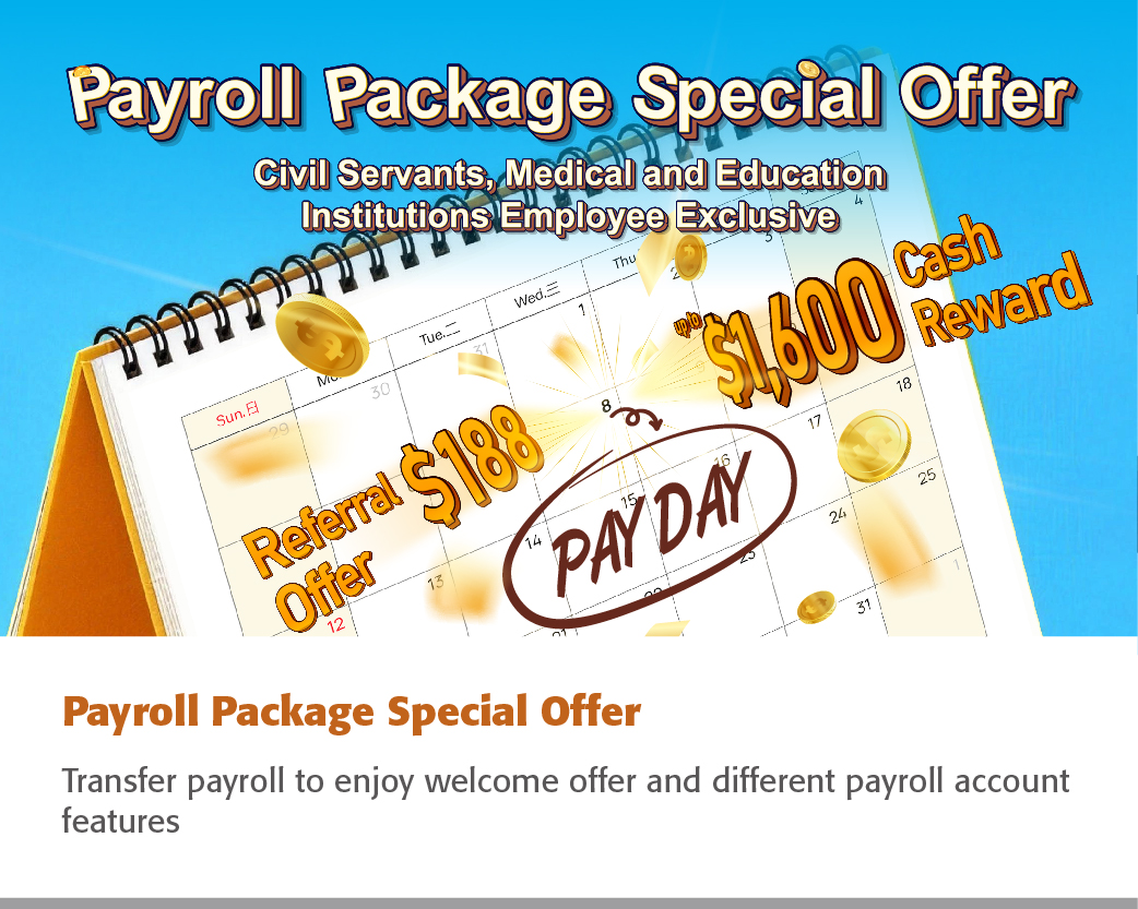 For Payroll Service with monthly salary of MOP50,000 above, the customer can enjoy MOP1,600 Cash Reward. |