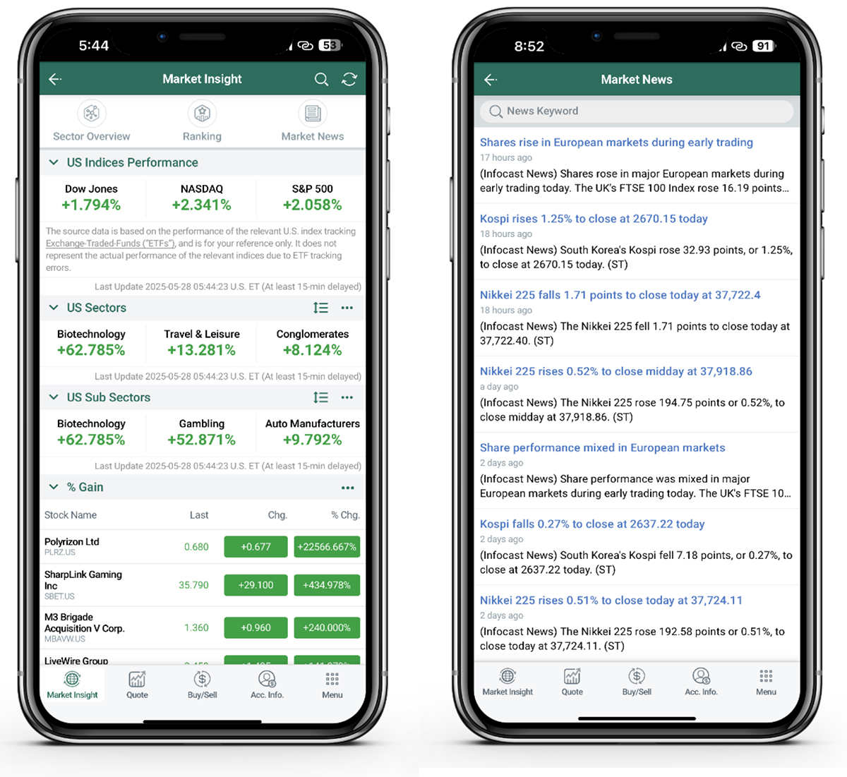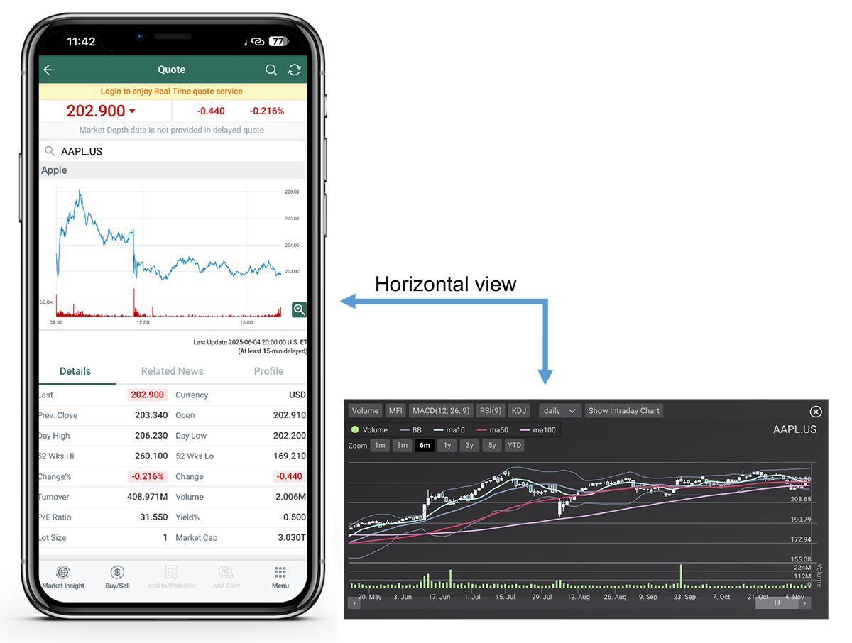 After downloading BCM Mobile US Stock Trading Services and without performing any login, you can enquire delayed Price Quote and view Market Insight.