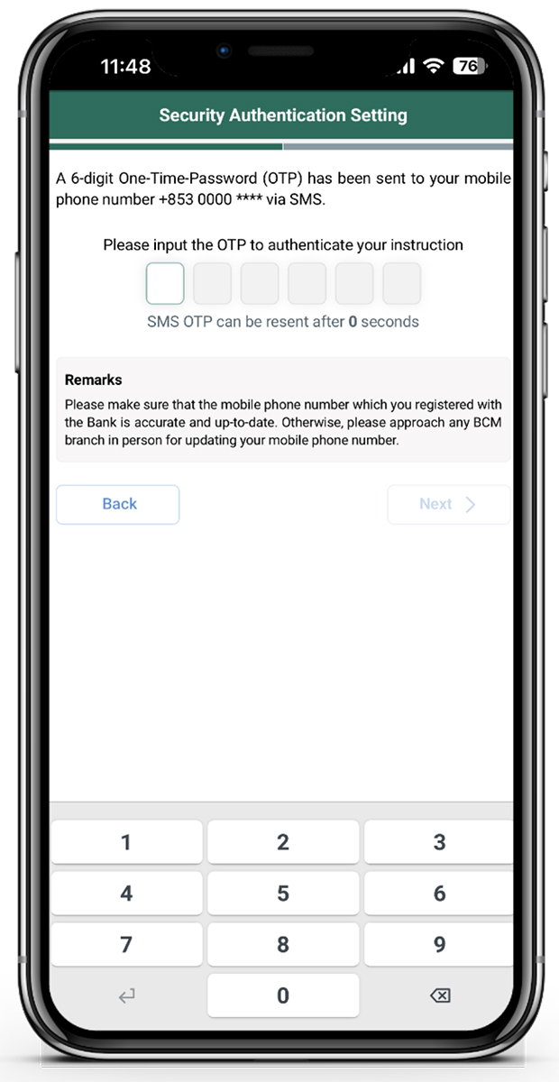 3.3 A SMS One-Time Password (OTP) will be sent to your registered mobile number by the bank to authenticate this instruction, please input the SMS One-Time Password (OTP) and then click “Next” button.