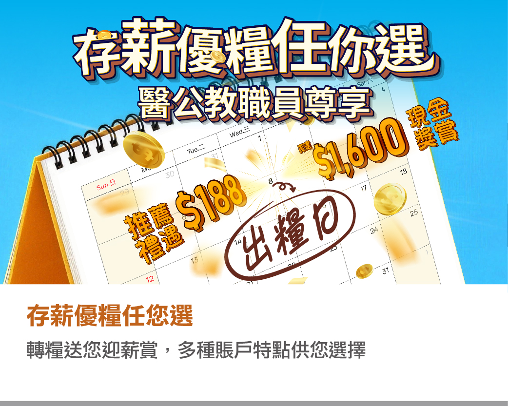 | 澳門現任全職公務員、醫療及教育機構職員("合資格客戶")於本行成功開立/登記出糧戶口,並於開立/登記當日計起首兩個月內錄有首次出糧記錄,可享以下相應現金獎賞: |
