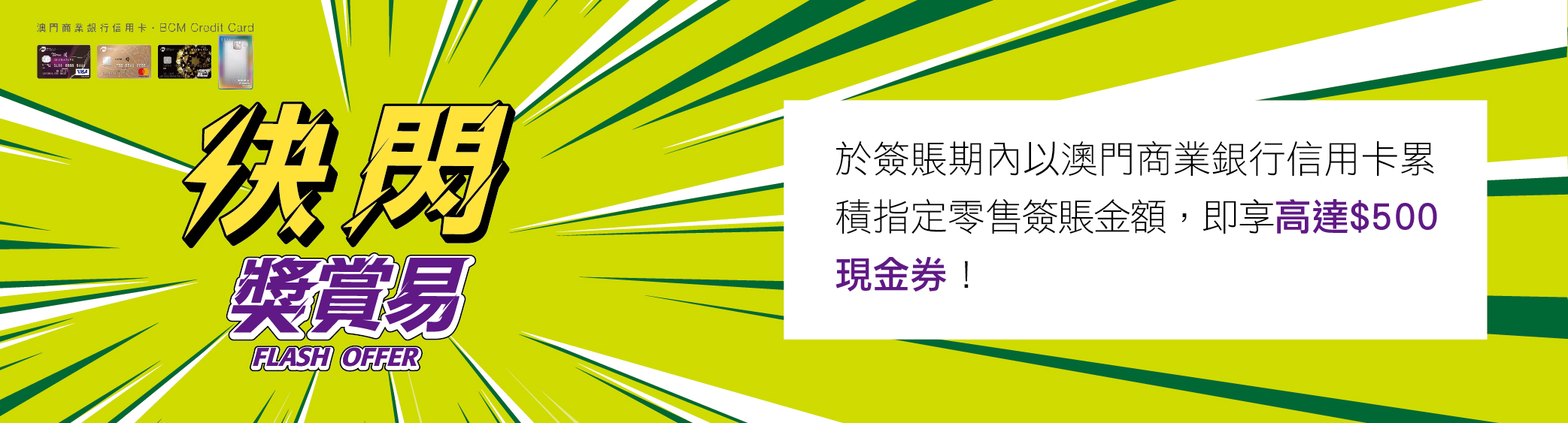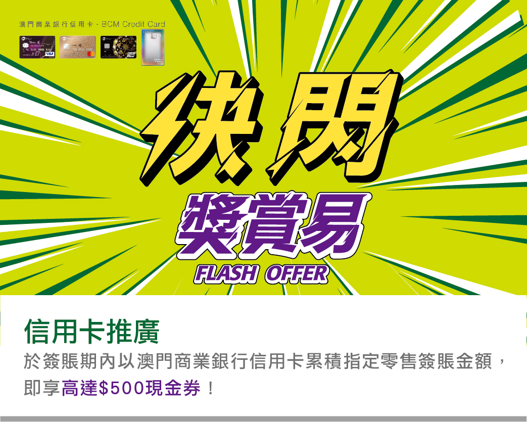憑BCM信用卡於簽賬期內累積2筆或以上本地零售簽賬滿指定金額,即可換領$50現金券!