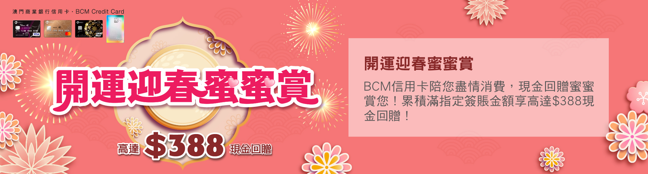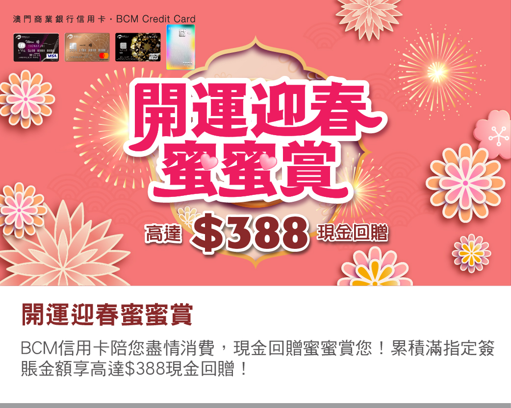 推廣期內憑成功登記之BCM信用卡簽賬滿 3 筆或以上合資格簽賬交易^並累積滿指定簽賬金額,即可享高達$388現金回贈!