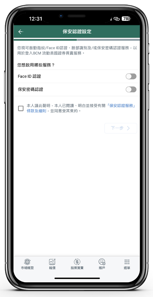 當點擊「下一步」前,請詳細閱讀並接受「保安認證服務之條款及細則」。