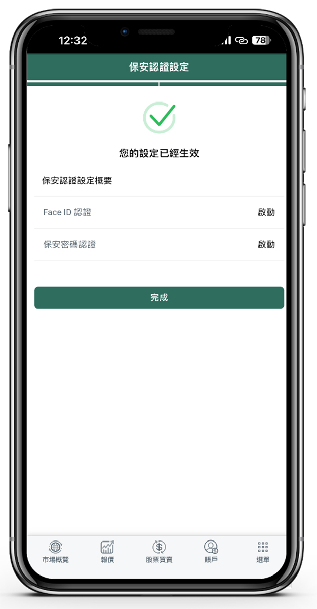 3.5 如選擇啟動臉部識別認證,請按照裝置畫面指示操作,並注視裝置上的鏡頭以進行Face ID / 臉部識別。