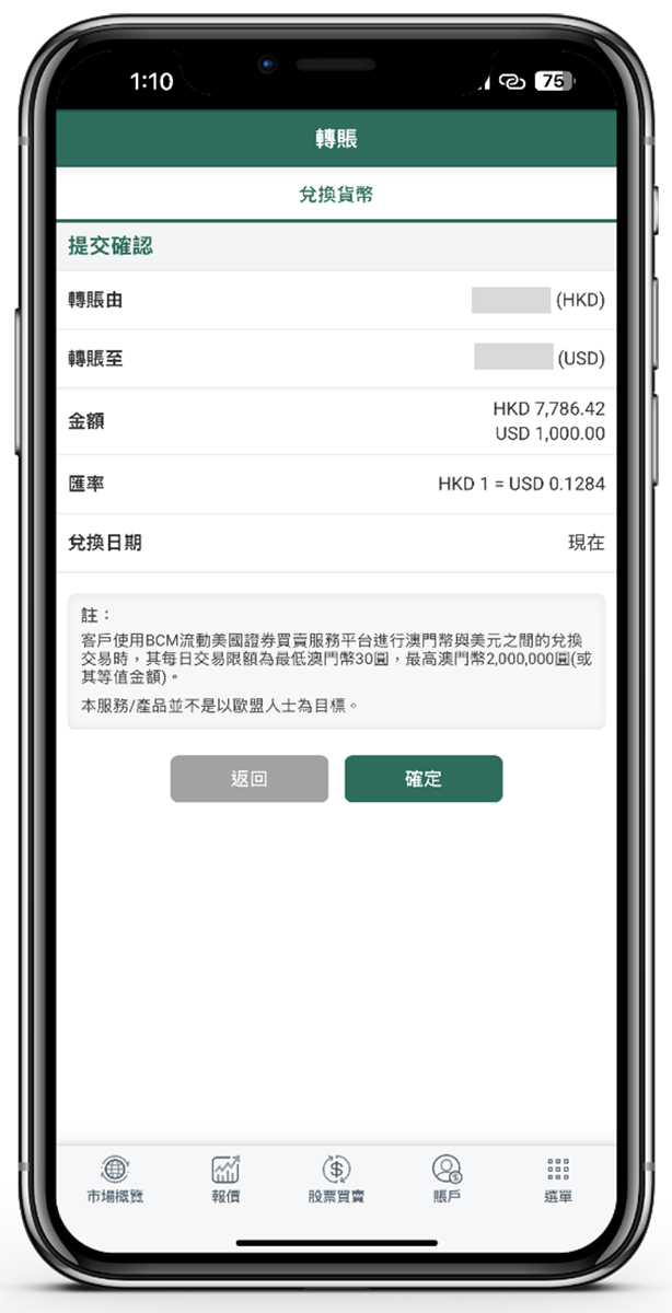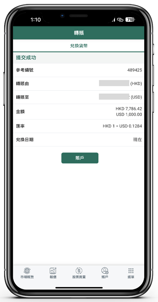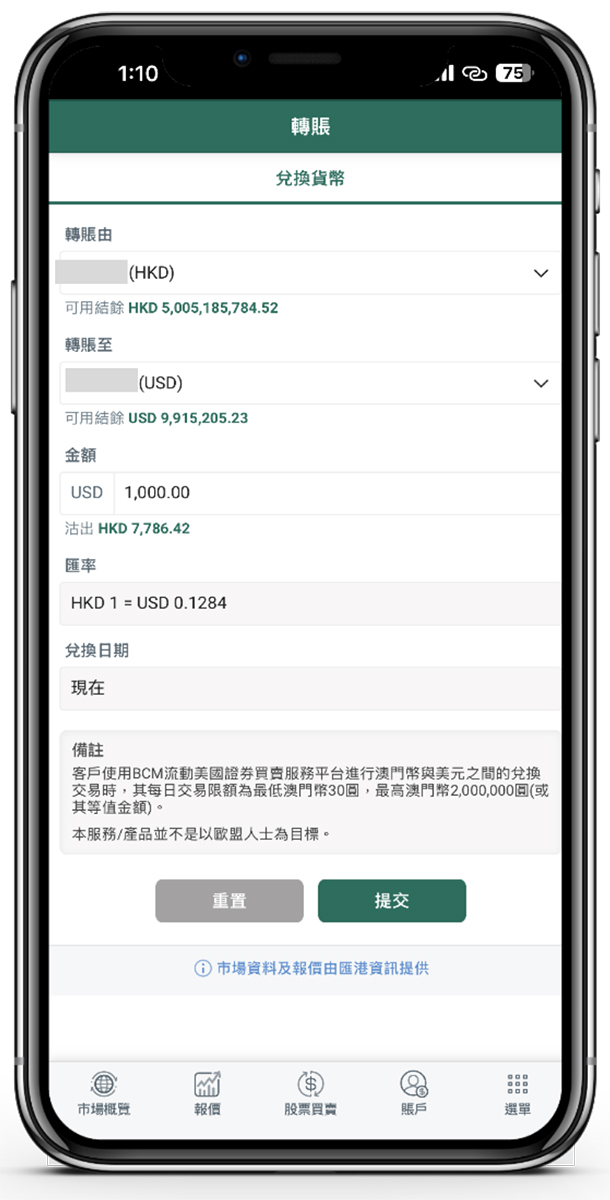 5.1 客戶可於「選單」->「交易相關」->「轉賬」功能以進行名下港幣賬戶與美元賬戶之間的貨幣兌換,請按照版面指示輸入轉賬資料,然後按「提交」至下一步。