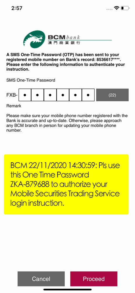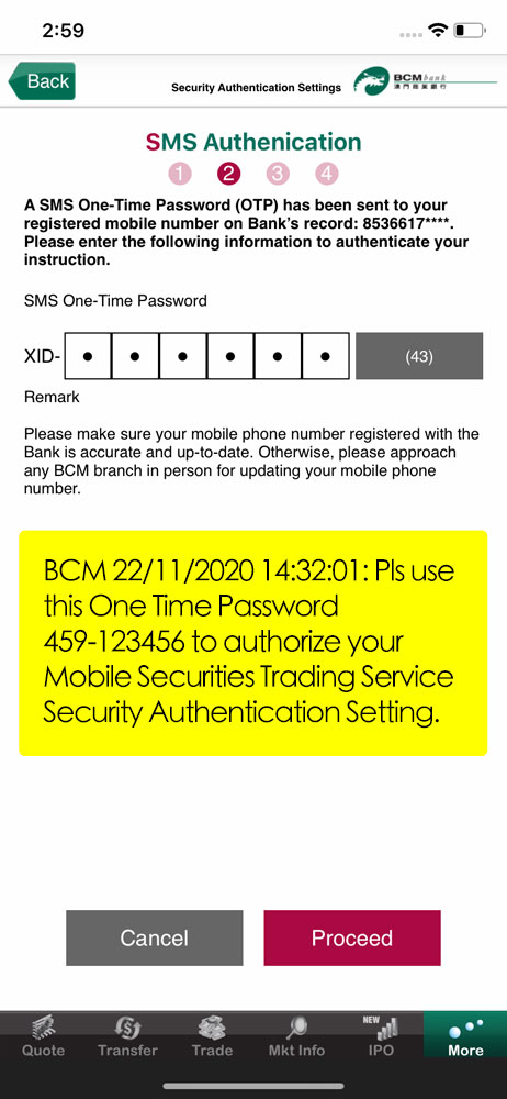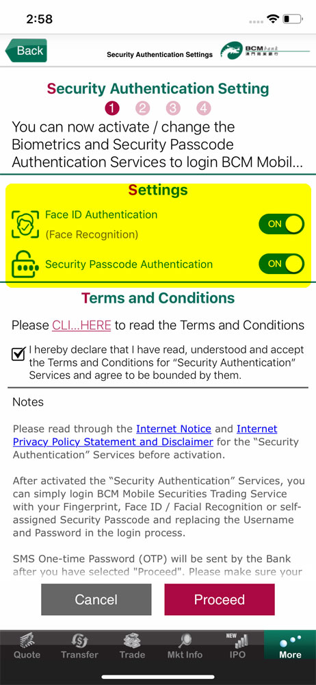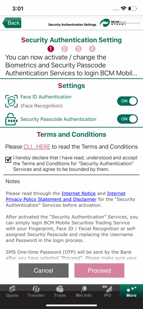 Before confirming to “Proceed” button, please read through and accept the Terms & Conditions for BCM Security Authentication Service.