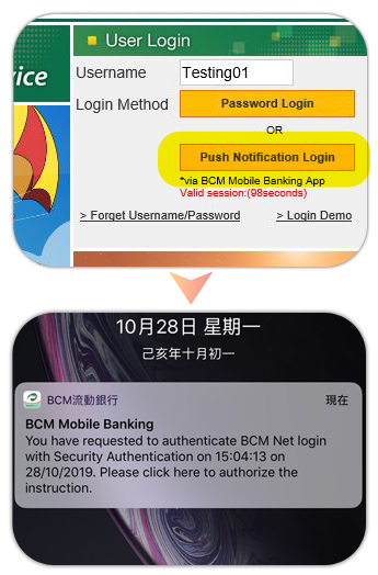 Furthermore, each Push Notification is only valid for 100 seconds. Upon expiry, please go back to the login page and click the button “Push Notification Login” to retry.