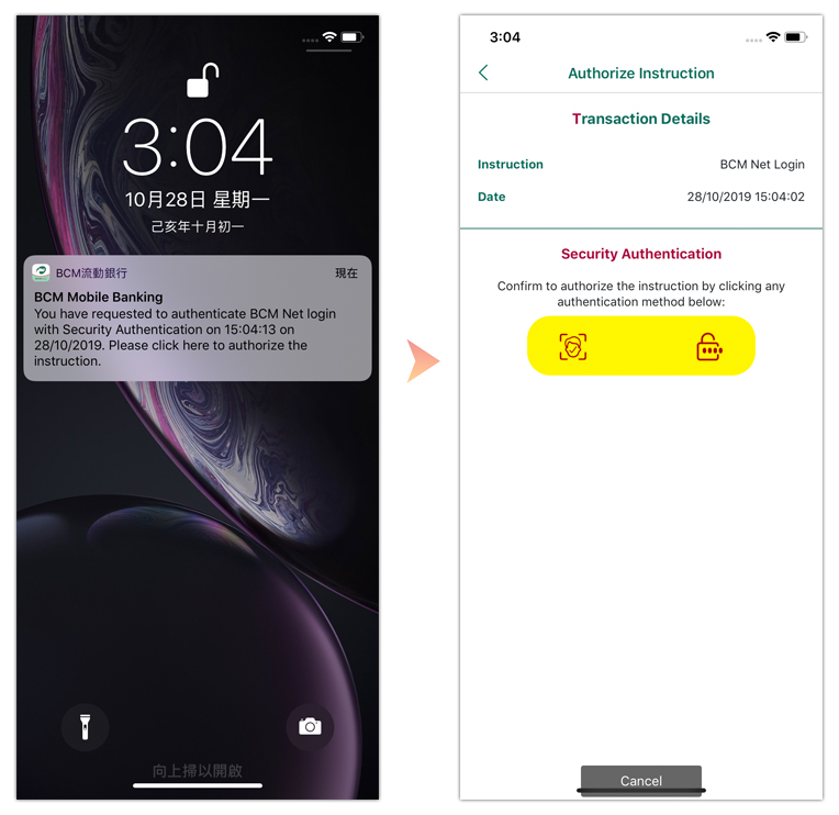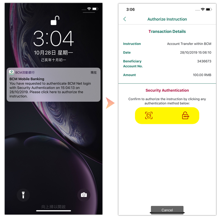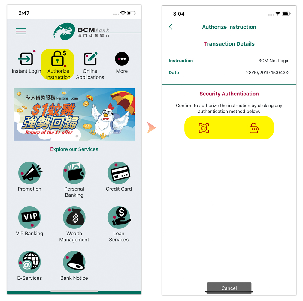 E. In case you have missed the prompting of push notification message, you can also access the instruction authorization directly by opening the BCM Mobile Banking App and clicking on the menu icon “Authorize Instruction” to view the details.