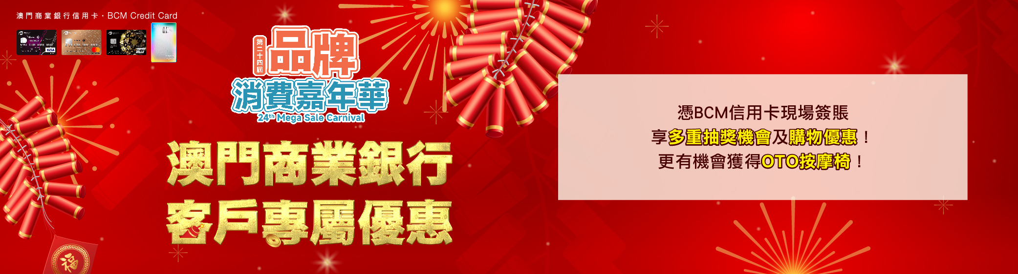 本澳年度大型展會盛事「第24屆品牌消費嘉年華」於2026年2月6日至8日隆重舉行!會場雲集各地品牌參展商,憑BCM 信用卡現場簽賬尊享多重抽獎機會及獨家購物優惠!