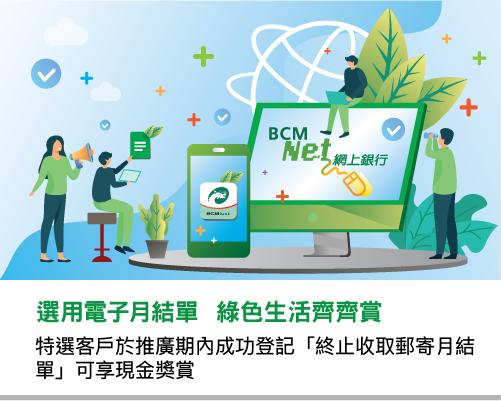 - 特選客戶全新申請BCM Net網上銀行服務並成功為所有結單戶口及信用卡登記「終止收取郵寄月結單」,