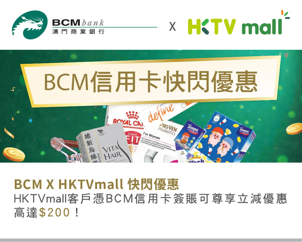 推廣期內,憑合資格BCM 信用卡於HKTVmall之網頁或流動應用程式單筆簽賬滿指定金額,並輸入指定優惠碼,可尊享立減優惠高達$200!