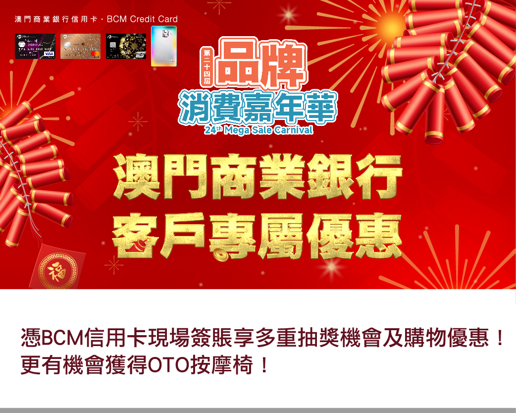 本澳年度大型展會盛事「第24屆品牌消費嘉年華」於2026年2月6日至8日隆重舉行!會場雲集各地品牌參展商,憑BCM 信用卡現場簽賬尊享多重抽獎機會及獨家購物優惠!